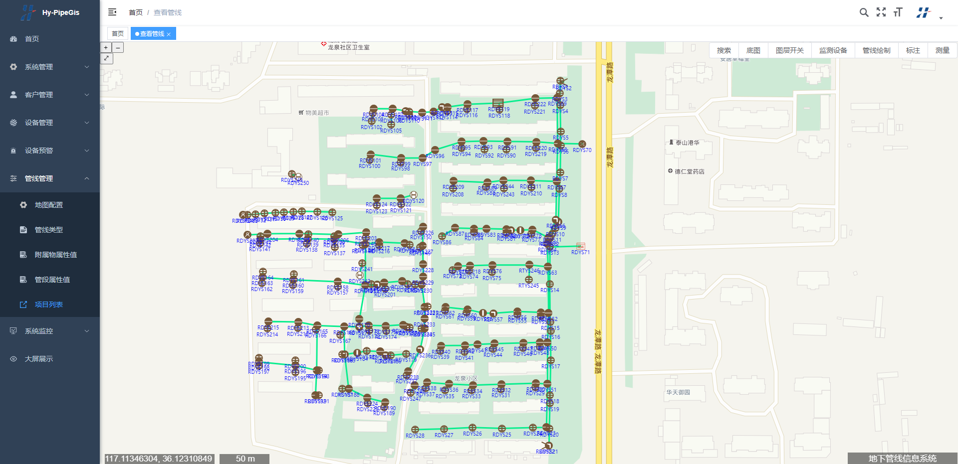 城市地下管線是指在城市規劃區范圍內,埋設在城市規劃道路下的給水、排水、燃氣、熱力、工業等各種管道、電力、電信電纜以及地下管線綜合管溝(廊)等。從管線傳輸或排放物質的性質來分,城市地下管線可分為給水、排水、燃氣、熱力、電信、電力、工業和綜合管溝(廊)八大類管線,每一大類管線還可根據傳輸或排放物質的差異或其功能的差異分為不同的小類,如給水管線可分為生活水、循環水、消防水、綠化水和中水等;燃氣管線可分為煤氣、天然氣、液化氣和煤層氣等;排水管線可分為雨水、污水和合流等;熱力管線可分為熱水、蒸汽和溫泉等;電力管線可分為供電、照明、電車、信號、廣告和直流專用線路等;電信管線可分為市話、長途、廣播、有線電視、寬帶、監控和專用等;工業管線可分為氫氣、氧氣、乙炔、石油、航油、排渣和垃圾等;綜合管溝(廊)管線可分為綜合管廊和綜合管溝等。